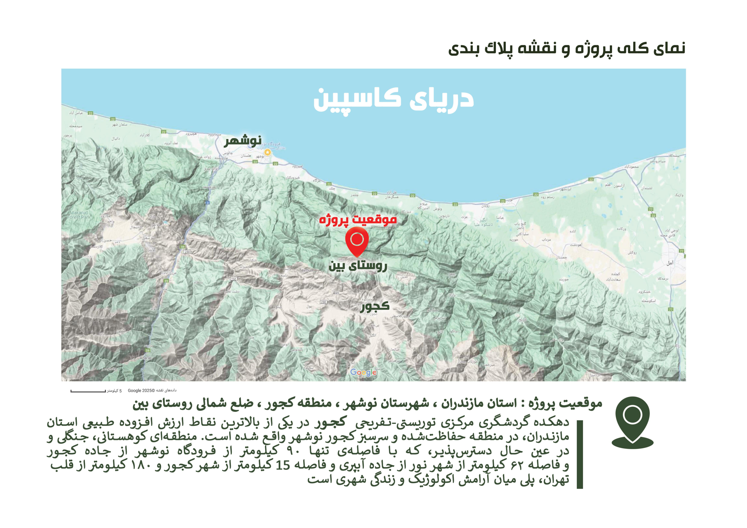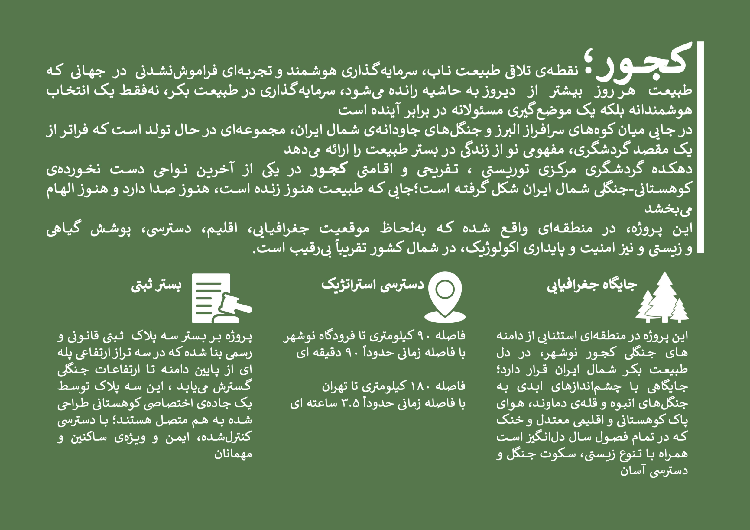 المجمّع السياحي–الترفيهي والإقامي لتطوير السياحة في كاجور، قد تأسّس في واحدة من آخر المناطق الجبلية–الغابية البكر في شمال إيران؛ حيث لا تزال الطبيعة حيّة، لا تزال تُسمَع، ولا تزال مصدر إلهام.