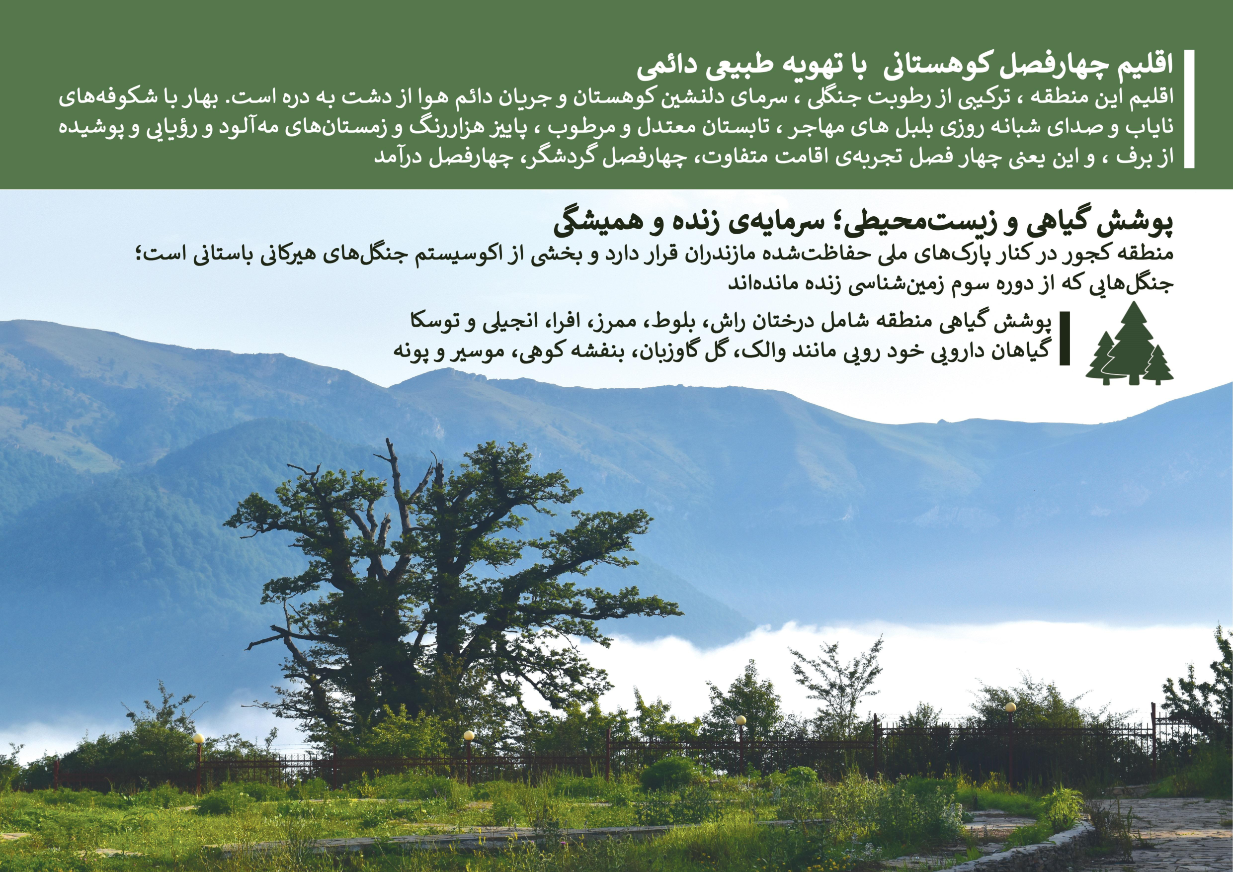 La région de Kajour est située à proximité des parcs nationaux protégés du Mazandaran, et fait partie de l’écosystème ancestral des forêts hyrcaniennes — des forêts qui ont survécu depuis le tertiaire géologique.
