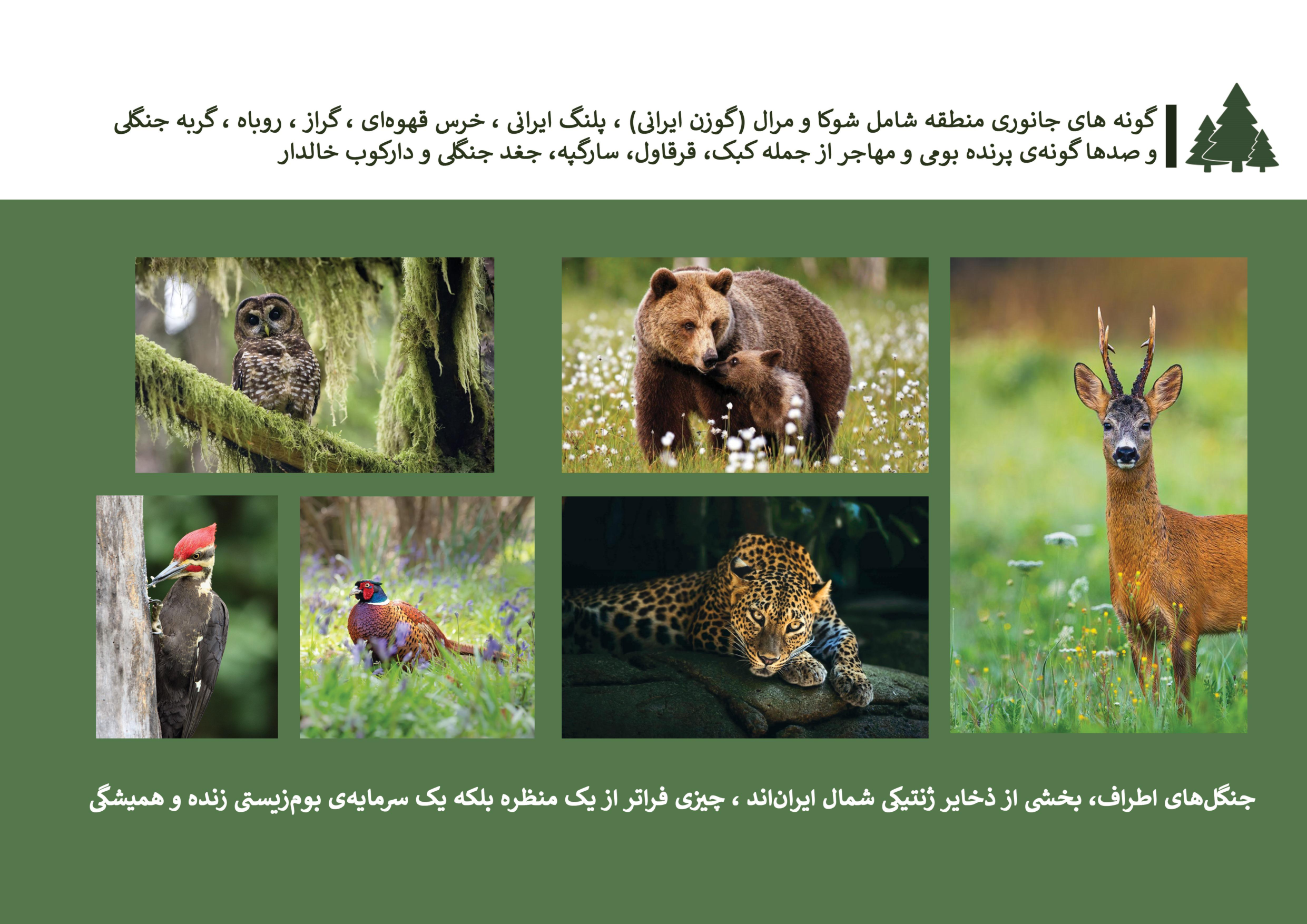 Wildlife in the region includes roe deer and red deer (Persian fallow deer), Persian leopards, brown bears, wild boars, foxes, wildcats, and hundreds of native and migratory bird species — including partridges, pheasants, buzzards, forest owls, and spotted woodpeckers.