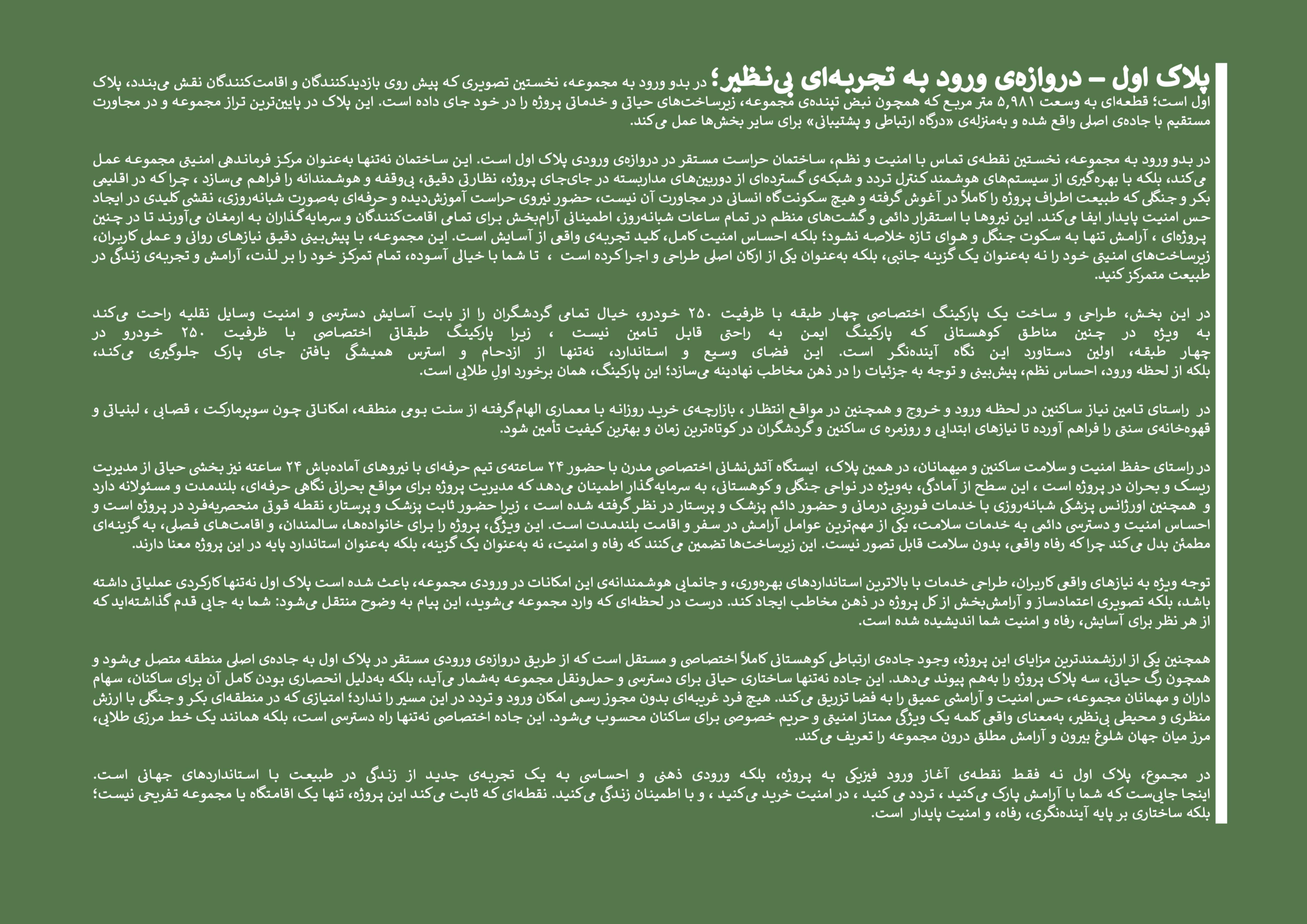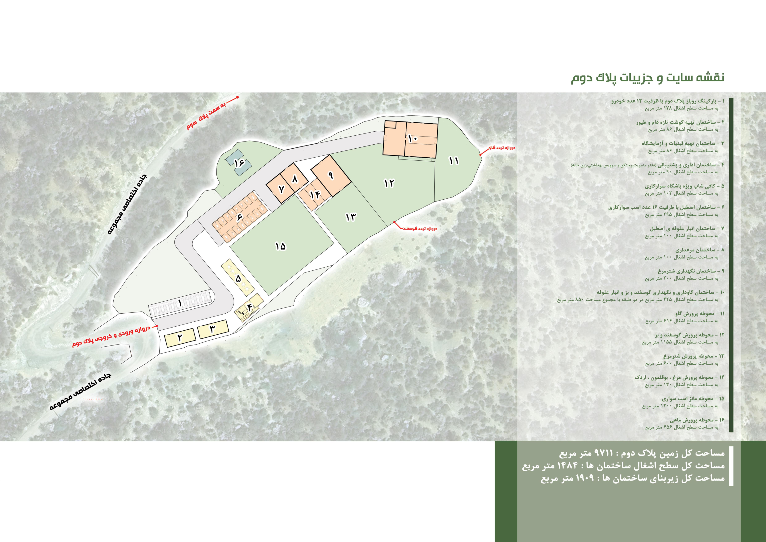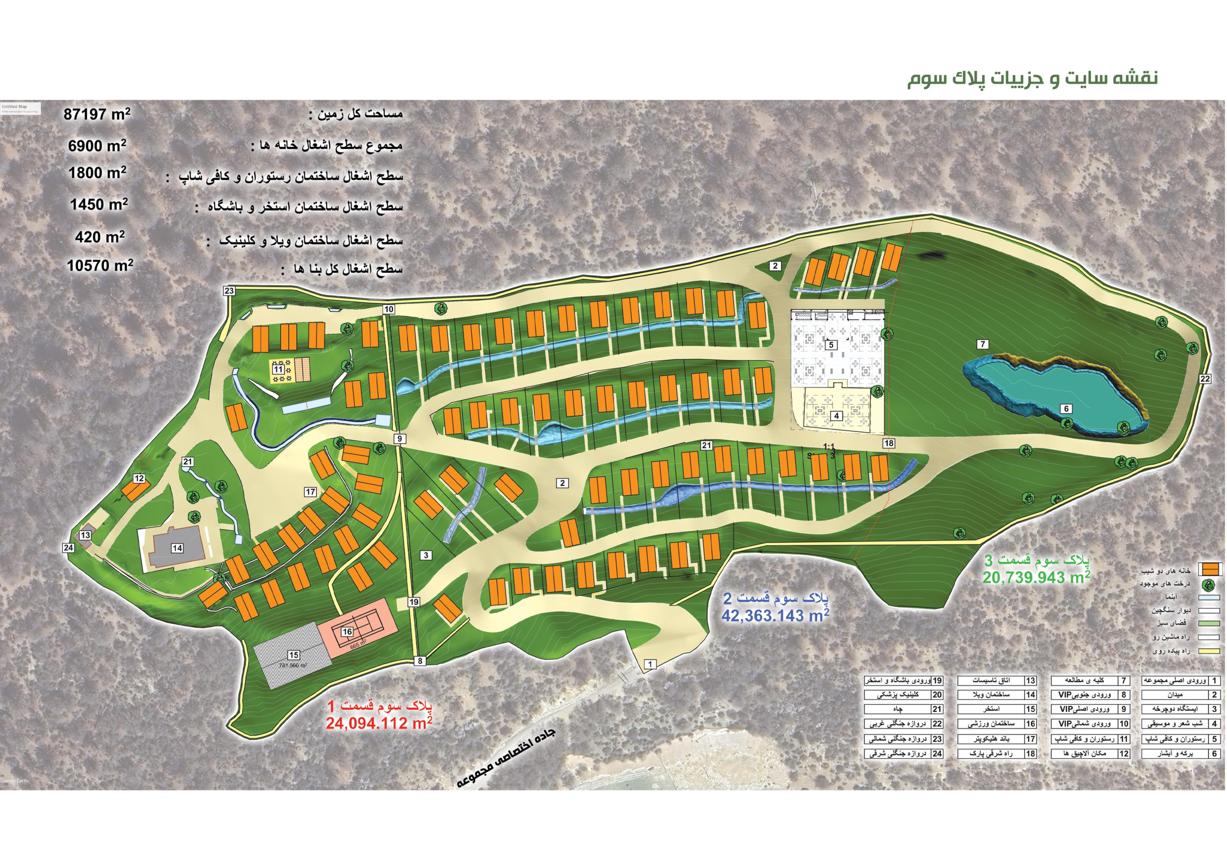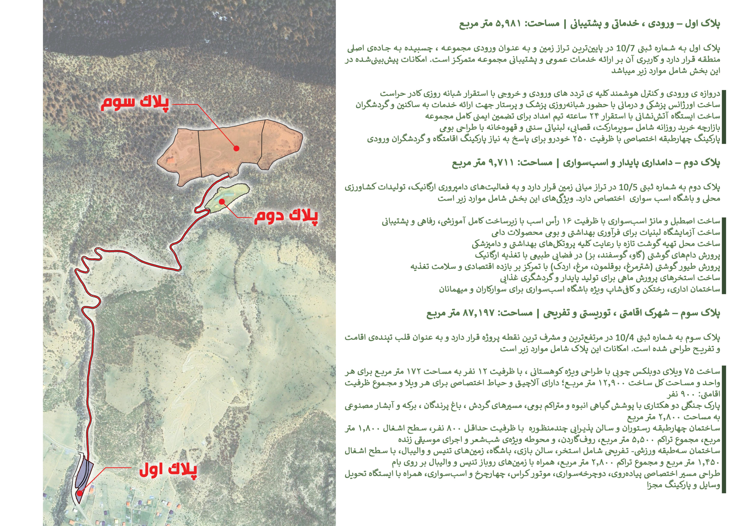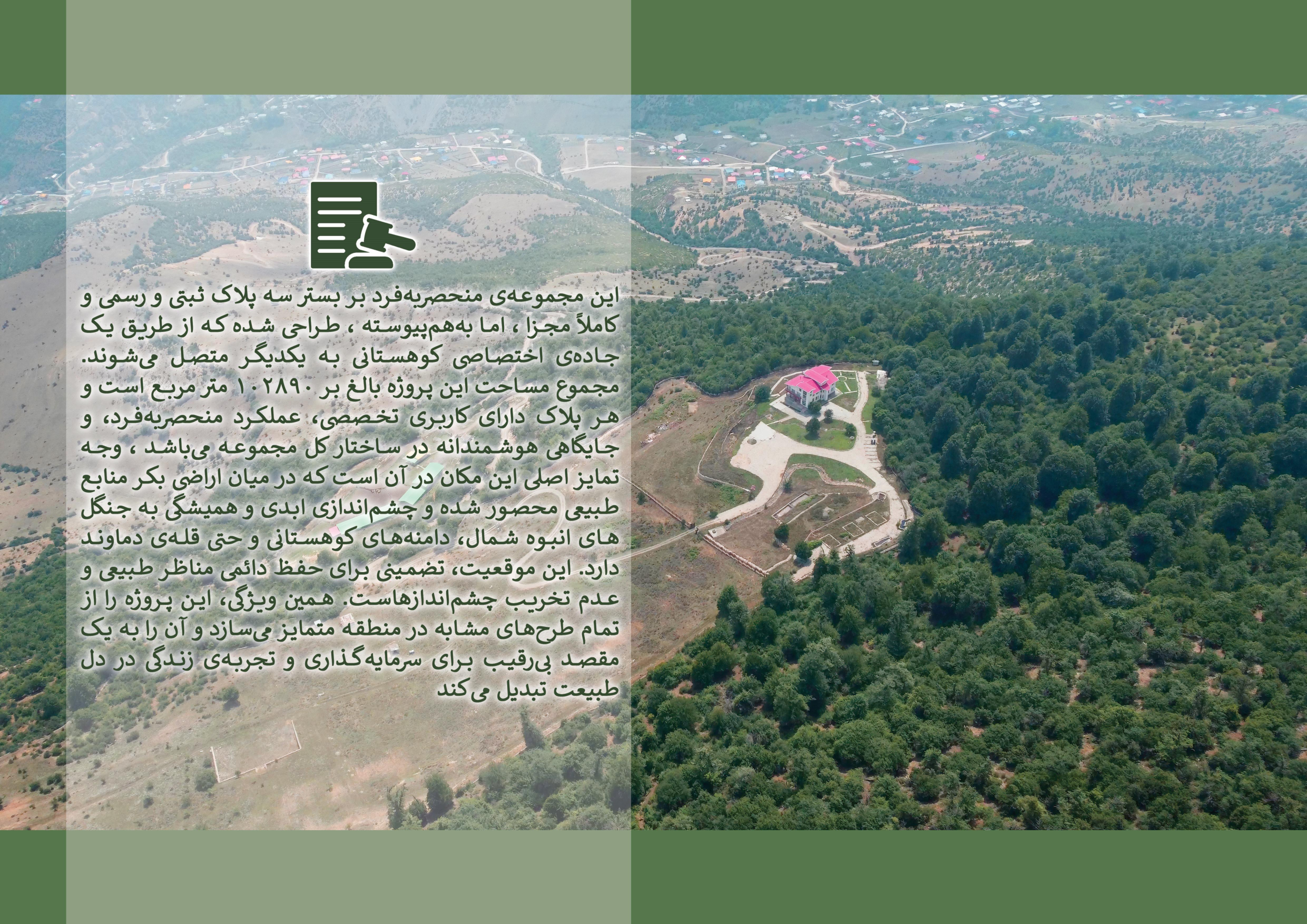 پروژه بر بستر سه پلاک ثبتی قانونی و رسمی بنا شده است که در سه تراز ارتفاعی پلهای، از پایین دامنه تا ارتفاعات جنگلی گسترش مییابد. این سه پلاک، توسط یک جادهی اختصاصی کوهستانی طراحیشده، به هم متصل هستند؛ با دسترسی کنترلشده، ایمن، و ویژهی ساکنان و مهمانان.