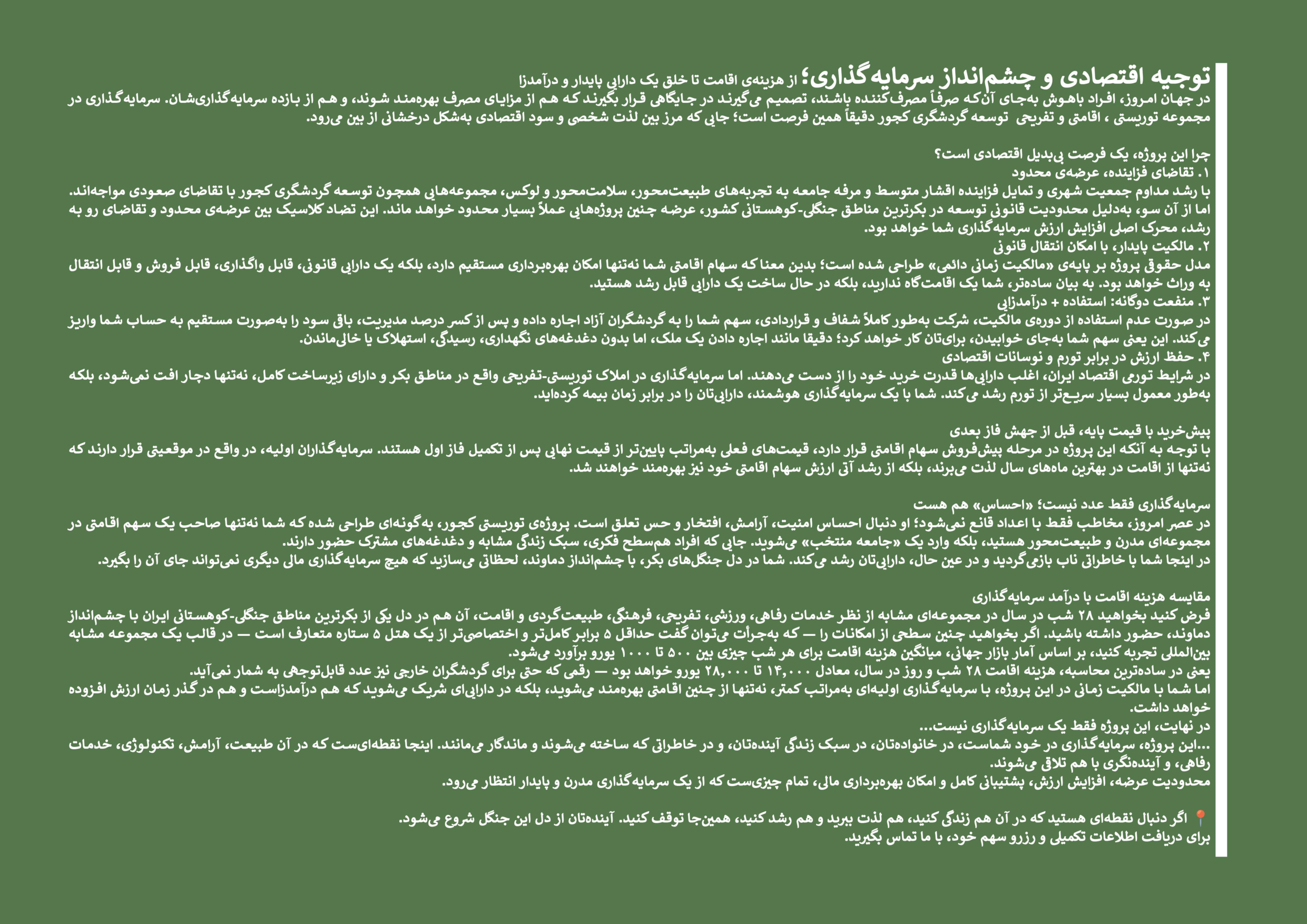 در تایم شیرینگ کجور، شما فرصتی استثنایی برای سرمایهگذاری هوشمندانه در دل طبیعت بکر شمال ایران دارید. این پروژه نه تنها تجربهای منحصر به فرد از اقامت در محیطی سرسبز و آرام را فراهم میکند، بلکه ارزش اقتصادی بلندمدت را نیز برای سرمایهگذاران تضمین مینماید. بهرهمندی از امکانات مدرن در کنار دسترسی به مناظر طبیعی چشمنواز، این مجموعه را به نقطهای ایدهآل برای علاقهمندان به سرمایهگذاری در گردشگری تبدیل کرده است.